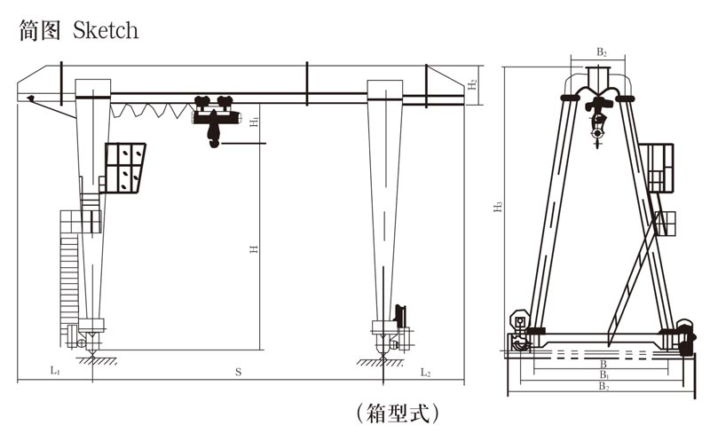 MH型電動葫蘆門式起重機,整機與CD1型或MD1型電動葫蘆配套使用,適合于露天作業(yè)的固定跨間,本機禁止吊運易燃易爆品,根據(jù)用戶要求還可以制成單端外伸懸臂式或無懸臂式結構。起重量為1-32T,跨度為7.5-35.5米,工作級別為A3,工作環(huán)境溫度為-25℃--40℃。